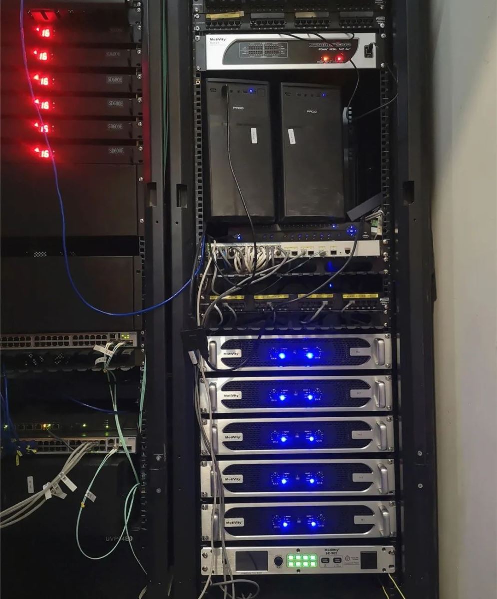 整個擴聲系統搭配H系列功放MA1610-F調音臺Stride8.8處理器SC-902電源時序器,保證了高品質的聲效輸出、保持了系統的穩定運行,更方便了人員的日常管理與使用。