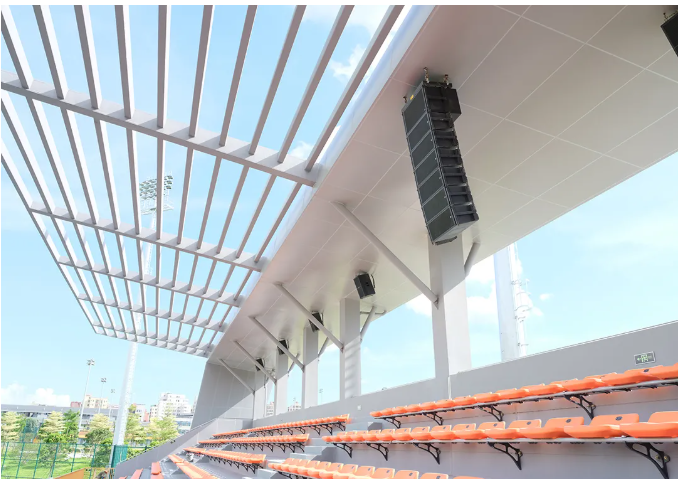 主擴聲系統采用MISSION的C-210XF防水線陣系統,擁有IPX6國際防護等級,最大聲壓級可達138dB,完美適用于需要高輸出、高清晰度的深圳市青少年足球訓練基地,搭配C-210XSUBF次低防水音箱,最大聲壓級可達145dB,分成兩組以6+1/組的形式懸吊于主場觀眾席中上方,結合具體安裝的角度和音箱的特性,很好的控制場地聲音的均勻覆蓋,完美的避免了過多聲泄漏。