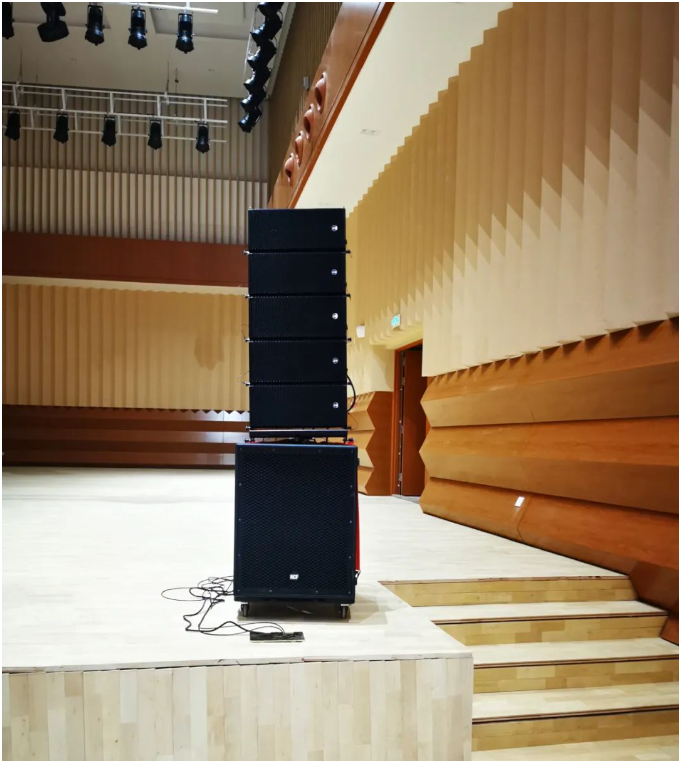 琴島音樂廳音響系統采自意大利進口品牌RCF音響,HDL有源線陣列系統,舞臺返聽為兩組ART300有源系列音箱。