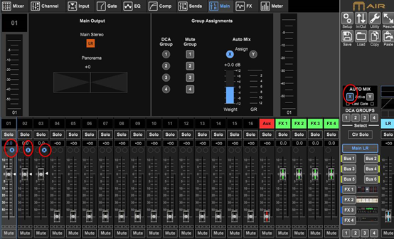 下面我給前三個通道編到X組,這里要注意的是,在給每個通道分完組之后,要記得把總的AUTO MIX的開關打開,如圖紅圈所示。