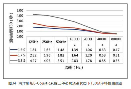 本項(xiàng)目總共進(jìn)行了兩次調(diào)試,第一次調(diào)試完成后,客戶在使用過(guò)程中感覺(jué)混響時(shí)間不足以滿足廳堂所有的應(yīng)用場(chǎng)景,故又根據(jù)客戶的需求進(jìn)行了第二次調(diào)試,增長(zhǎng)了混響時(shí)間。除了廳堂自身的固有聲學(xué)條件外,經(jīng)歷了兩次調(diào)試的E-Coustic系統(tǒng)共設(shè)置了10個(gè)混響時(shí)間預(yù)設(shè)模式,分別為1.5 s、1.7 s、1.9 s、2.2 s、2.6 s、2.9 s、3.2 s、3.5 s、4 s和6 s,同時(shí),還設(shè)置了一個(gè)對(duì)廳堂本身聲學(xué)問(wèn)題進(jìn)行一定程度修復(fù)的語(yǔ)音舒適模式。現(xiàn)場(chǎng)調(diào)試完成后選取了1.5 s、1.7 s及3.5 s預(yù)設(shè)進(jìn)行了實(shí)地測(cè)量,T30的測(cè)量結(jié)果如圖34所示。此外,系統(tǒng)本身對(duì)初始時(shí)間間隙、早期反射聲、混響能量等聲學(xué)參數(shù)均可單獨(dú)調(diào)節(jié),這也極大地豐富了系統(tǒng)的綜合調(diào)控能力,使整個(gè)聲學(xué)空間的真實(shí)感和內(nèi)部參數(shù)間的適配度得以有效提升。