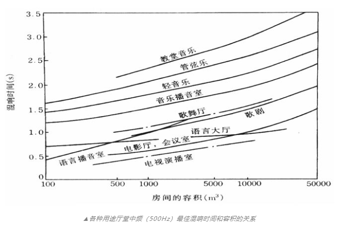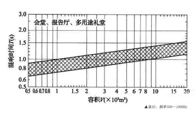 對于不同類型的音響工程,混響時間的要求有所不同;同類型的工程,不同的聲場大小,混響時間的指標也有不同。一般來講,我們可以在500Hz和1000Hz兩個地方計算聲場的混響時間。