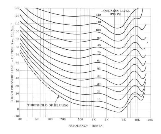 在進行聲壓級計算前,必須選擇一個相應環境下合適的基準聲壓級,而基準聲壓級的選擇必須了解正常人耳的等響曲線,即“Fletcher-Munson curves(弗萊徹芒森曲線)”。