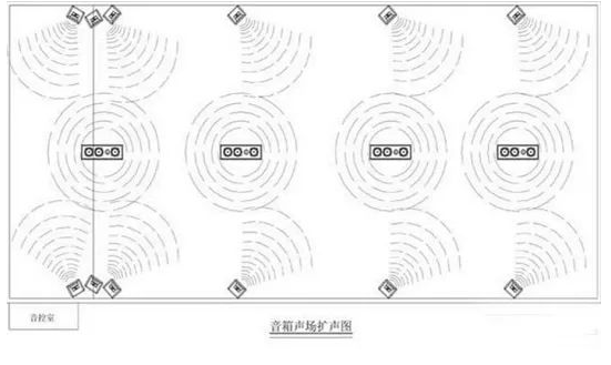 一般說來,狹長廳堂的擴聲,一定要音箱的擴聲區域盡量沿長邊展開;空間較高的擴聲場合,要盡量將音箱位置抬高,最好是略微向后場傾斜;如果是在空間和面積都較大的地方進行擴聲,就應該考慮將音箱集中懸掛成圓弧形形成均勻的聲音擴散。