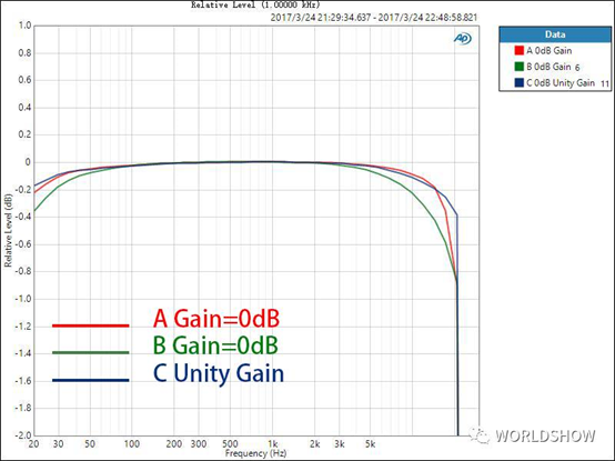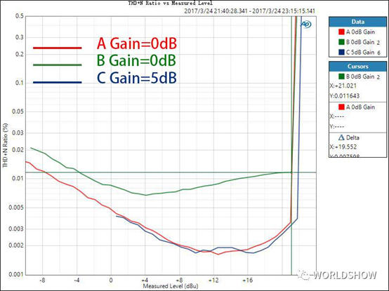 對于數(shù)字調(diào)音臺,我們不僅要關(guān)心話放增益在0dB時的THD+N比率,還需要了解到,話放增益在不同位置時的情況,因?yàn)檫@是使用中的實(shí)際情形。話放的增益在不同大小時,其引入的噪音和失真也是不同的,了解這一點(diǎn)對于用戶正確設(shè)置增益也很有參考意義。