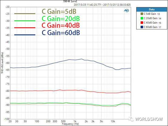 圖6. C型號調(diào)音臺話放增益在不同時的THD+N Level
