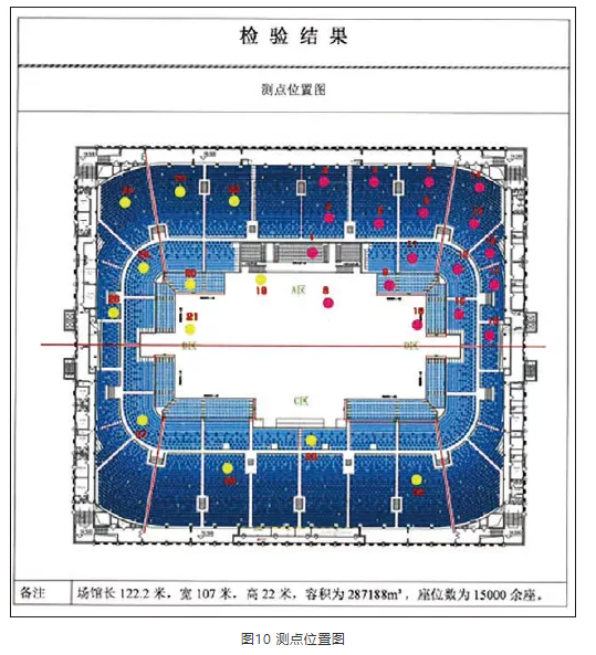 施工完畢后,進行了現場實測,測點如圖10所示。經現場測試,擴聲系統聲壓級可基本達到設計值,其他測量結果見圖11、表2—表4。測試結果反映,該項目達到設計目標及行業相關標準指標。