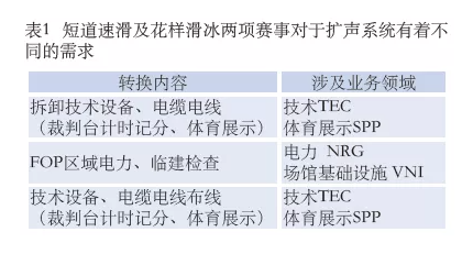 • 冬奧會期間,短道速滑及花樣滑冰兩項賽事對于擴聲系統有著不同的需求,如表1所示,并且轉換時間短,只有半天的時間。