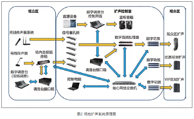 場地擴聲系統作為覆蓋區域為觀眾席區以及比賽場地(FOB)的固定安裝擴聲系統,主要滿足比賽所需的語言節目并兼顧音樂播放的擴聲要求。