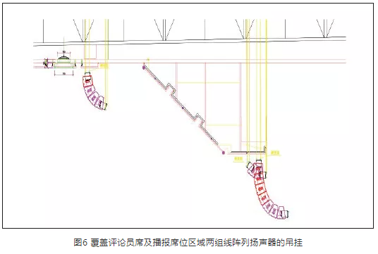 對于聲場的設計,揚聲器系統既考慮主席臺區的覆蓋,又要考慮整個觀眾區的覆蓋;在揚聲器選型上,要符合重量要輕、體積小、聲壓大等性能,以滿足承重、避免建聲缺陷、提高語言清晰度、避讓視頻照明等其他設備等一系列的相關要求。通過仿真軟件NS-1模擬設計,確定揚聲器數量、吊掛高度、投射角度等,以達到體育建筑設計規范一級指標,聲壓級為105 dB,語音清晰度指數不小于0.5,聲場模擬點位如圖3所示。不同的區域根據實際的面積、縱深覆蓋需求,對線陣列揚聲器的數量、分頻、吊掛角度與高度進行配置。主擴聲揚聲器系統采用14組雙12英寸三分頻無源全頻線陣列揚聲器,吊掛覆蓋整個觀眾區。其中,北側方向共分8組,每組根據覆蓋區域分別由2~8只揚聲器單元組成;東西方向各1組,每組4只揚聲器單元;南側方向共分4組,每組根據覆蓋區域分別由4~8只揚聲器單元組成。揚聲器布置平面圖如圖4所示。以評論員席以及播報席區域為例,由于區域觀眾席第一排至最后一排的高差為15 m,如圖5所示,因此使用了2組線陣列揚聲器進行覆蓋,分別使用了4只、7只揚聲器單元,其吊掛角度、高度分別為-7°、20.5 m,-2°、17.9 m,如圖6所示。