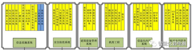 醫院智能化系統可拆分6大子系統,包括信息基礎設施系統、公共安全系統、醫護專用系統、建筑設備管理系統、綜合集成管理系統、機房工程。