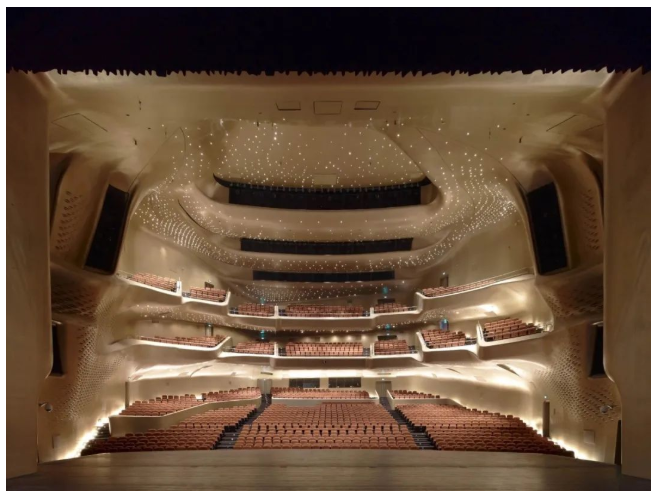 為了減小回聲、提高語(yǔ)言清晰度,同時(shí)加強(qiáng)混響,提升音樂(lè)豐滿性,劇院歌劇廳內(nèi)飾面、座位等的材料選擇與外形設(shè)計(jì)十分重要。一般情況下聲音最佳反射時(shí)間為1-1.3秒。