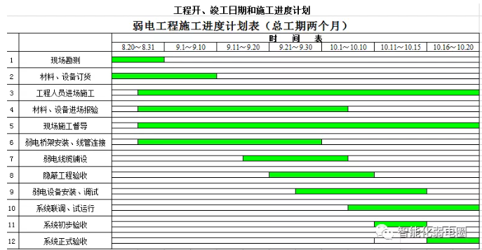 施工進(jìn)度階段劃分:會描述弱電項目的總工期,以及項目需要分為多個階段進(jìn)行,比如施工準(zhǔn)備、技術(shù)交底、安全培訓(xùn)階段,穿線、配管階段,設(shè)備安裝階段,系統(tǒng)調(diào)試、試運行及整改階段,以及人員培訓(xùn)、竣工驗收等階段。