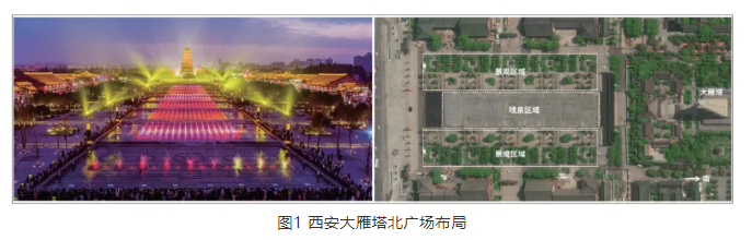 演出場地位于西安大雁塔北廣場,廣場北起雁塔路南端,南接大慈恩寺北外墻,東到廣場東路,西到廣場西路,東西寬480 m,南北長350 m。整個廣場由水景噴泉、文化廣場、園林景觀、文化長廊和旅游商貿設施等組成。整個廣場以大雁塔為中心軸三等分,中央為主景水道,左右兩側分置文化園林景觀等,如圖1所示。演出舞臺區與主要觀眾觀演區均在主景水道的噴泉區域。