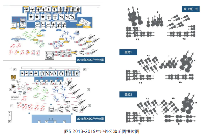 還有一種比較常見的擺位,在1777年由德國作曲家阿貝福格勒提出,19世紀下半葉被廣泛采用,通常稱之為歐式(德式)擺位。這種擺位關系下,有利于首席小提和首席大提、大提和貝斯的交流,特別是在合奏樂段的部分。在該演出中,一提和二提兩組相對而坐,會有一提二提一問一答的樂段,使聲像形成立體效果,且由于二提的f音孔朝向舞臺內側與f音孔朝向觀眾的一提音色也有著微妙并明顯的差異。