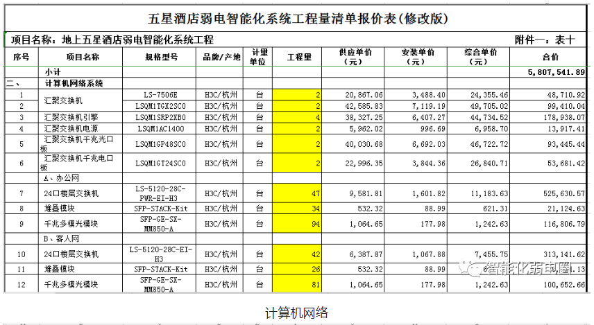 一套五星級酒店智能化弱電系統工程量清單(預算千萬級,可參考)