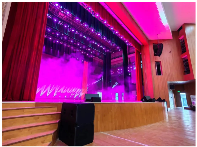 其中主擴聲系統采用德國TWAUDiO VERA20i 雙10寸線陣列揚聲器12只以左右兩組吊掛在舞臺上方,搭配4只 VERA32心形指向超低音揚聲器。