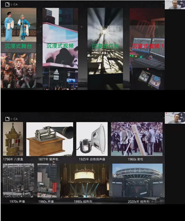 通過摩托車環繞的音效視頻,介紹了主講嘉賓與其團隊如何通過3D科技制造環繞音效,帶給觀眾沉浸式的聽覺體驗。并且講解追蹤器與拾音話筒如何結合實現實景與藝術結合。音響與舞臺、燈光、布景的融合是未來演出的一種趨勢,能帶給觀眾更真切的體會。