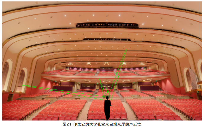 在歌劇院中,歌手和樂隊都需要聽到來自觀眾廳的聲音反饋,然后根據反饋的聲音相應地控制自己的歌唱和演奏的響度。歌唱歌手特別希望喜歡聽到他們的聲音在一個比較舒暢的發聲水平時能“充滿大廳”。這就需要池座的后墻、挑臺欄板以及吊頂等部位能夠將聲音反射到舞臺和樂池內。但需要合理控制反射聲的大小,避免反射聲太強,成為回聲。