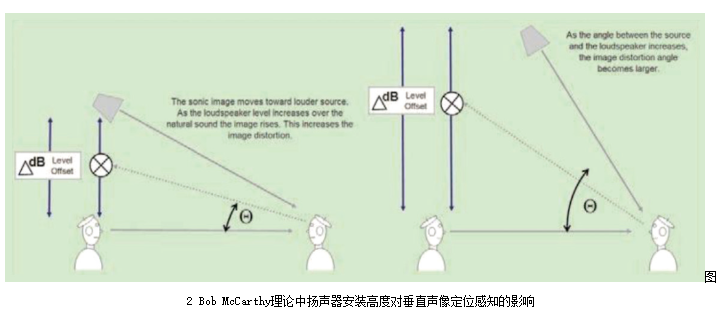 任何解決方案都存在一定的局限性。這些局限性主要來自于劇場的尺寸、舞臺(tái)的結(jié)構(gòu)、觀眾席座位的分布以及劇場的聲學(xué)環(huán)境等要素。使用中置揚(yáng)聲器對(duì)于那些舞臺(tái)鏡框特別高的場地可能不是一個(gè)好的選擇。吊掛的高度決定了聲源發(fā)出的位置(見圖2),若揚(yáng)聲器與觀眾席垂直方向的夾角大于30°,位于前排的觀眾就有可能會(huì)感覺到垂直方向上的聲像漂移,產(chǎn)生人聲或?qū)Π讈碜灶^頂而非前方的感覺。此時(shí),設(shè)計(jì)時(shí)可以考慮通過臺(tái)唇補(bǔ)聲系統(tǒng)來覆蓋前排觀眾席,中置系統(tǒng)從3排或4排之后的區(qū)域開始覆蓋。