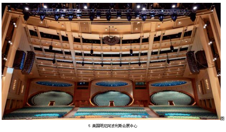 此外,還有一些劇場由于應(yīng)用場景的不同,揚(yáng)聲器系統(tǒng)既要減少舞臺(tái)垂直方向上對(duì)觀眾的視覺影響,還要滿足較寬觀眾席對(duì)水平覆蓋的需求。例如美國明尼阿波利斯會(huì)展中心使用ARCS恒定曲率線陣列揚(yáng)聲器,這種揚(yáng)聲器陣列在垂直方向上的輻射角度不可調(diào)整,但水平角度上中置揚(yáng)聲器幾乎可以覆蓋到整個(gè)觀眾席,甚至可以比左右聲道揚(yáng)聲器承擔(dān)更大的功率,這對(duì)于以語言類為主的會(huì)議等應(yīng)用場景來說是十分方便且有效的。